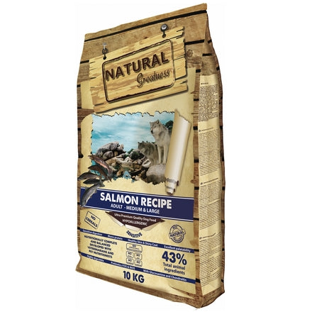 La recette au saumon Natural Greatness est une excellente formule ultra-premium, hypoallergénique et monoprotéique formulée sans céréales, conçue pour les chiens adultes de races moyennes et grandes ayant des problèmes de peau ou de pelage.
